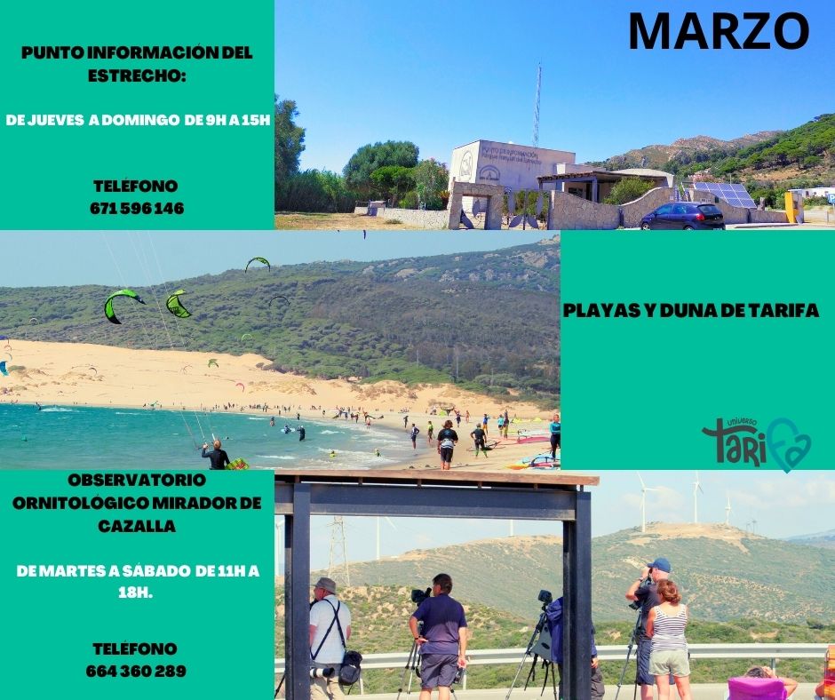 En marzo en Tarifa puedes visitas el Punto de Información del Estrecho y el Observatorio ornitológico de Cazalla, que además en este mes programa el evento de Bienvenida de Aves, Mig Bird. Las playas son otra opción.