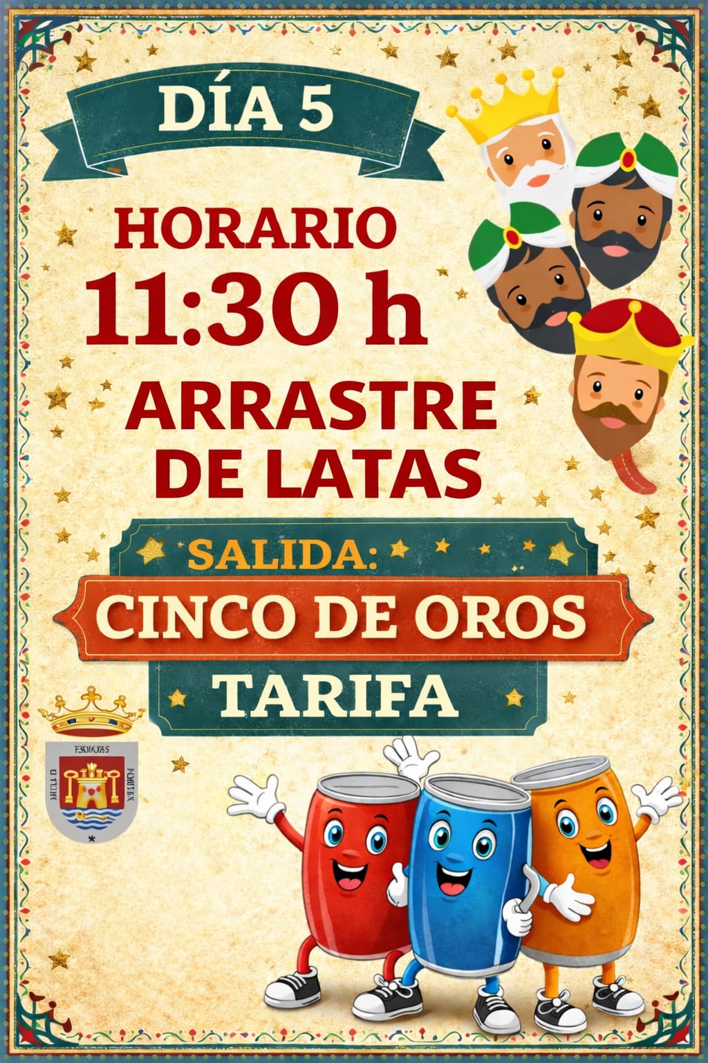 El arrastre de latas partirá como siempre de la plazoleta Cinco de Oros de la Alameda para continuar por las calles San Sebastián, Arapiles, y Batalla del Salado dirección puerta de Jerez. A partir de ahí seguirá por calle de la Luz, Sancho IV el Bravo, San Francisco, y Santísima Trinidad hasta llegar a las puertas del Castillo. El recorrido comenzará a las once y media de la mañana.