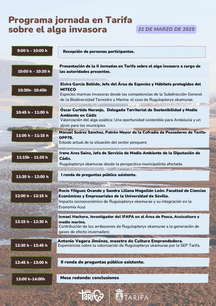 La jornada tiene como objetivo concienciar sobre el impacto que esta especie exótica invasora está teniendo en nuestros ecosistemas marinos y en la economía local, así como presentar las acciones que se están llevando a cabo para su control y erradicación. Durante el evento, se contará con la participación de representantes políticos del Ayuntamiento de Tarifa, Diputación Provincial de Cádiz, Junta de Andalucía, Ministerio para la Transición Ecológica y el Reto Demográfico, representantes del sector pesquero y personas expertas en biología marina e investigación, que compartirán sus conocimientos y experiencias.