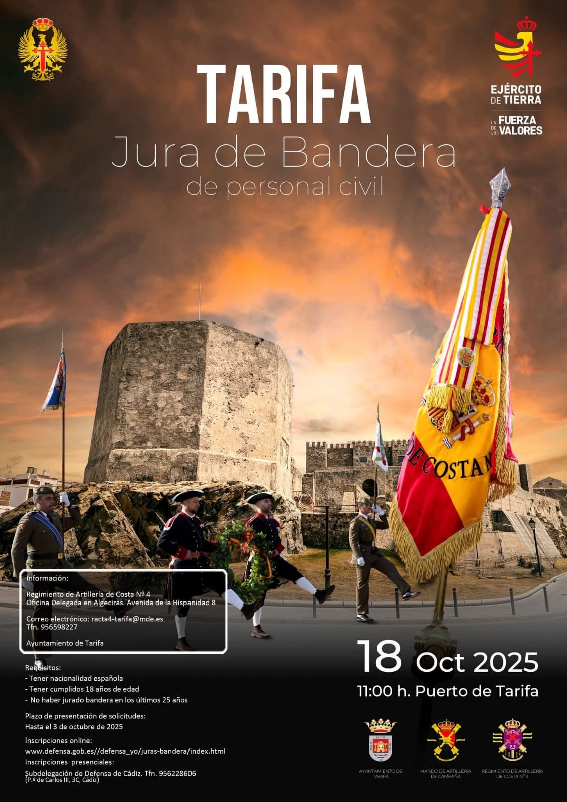 El acto de Jura de Bandera de personal civil se celebrará el sábado, 18 de octubre de 2025 a las 11.00 h, en la explanada del Puerto de Tarifa, con vistas al Estrecho de Gibraltar, estrechando los vínculos entre el Ejército y la ciudadanía.