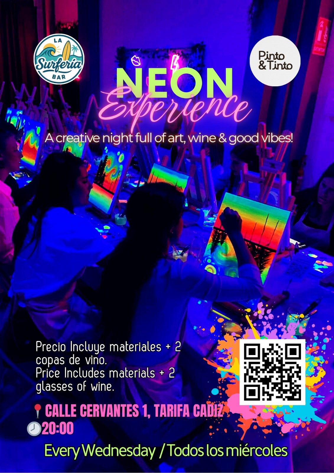 Todos los miércoles a las 20:00, La Surfería Tarifa se transforma en un luminoso estudio de arte para nuestra Experiencia de Vino y Arte – Neón, presentada por Pinto & Tinto y la cocreadora Angie. Disfruta de una velada creativa única en el corazón de Tarifa, donde el arte, el vino y el buen rollo se fusionan. Bajo la suave luz de las luces de neón, pintarás, disfrutarás y conectarás con otros en un ambiente relajado e inspirador. Cada sesión incluye todos los materiales necesarios y dos copas de vino (blanco o tinto) para dar rienda suelta a tu creatividad. Tanto si eres artista, viajero o simplemente buscas algo diferente que hacer en Tarifa, este taller es la combinación perfecta de diversión, relajación y color.