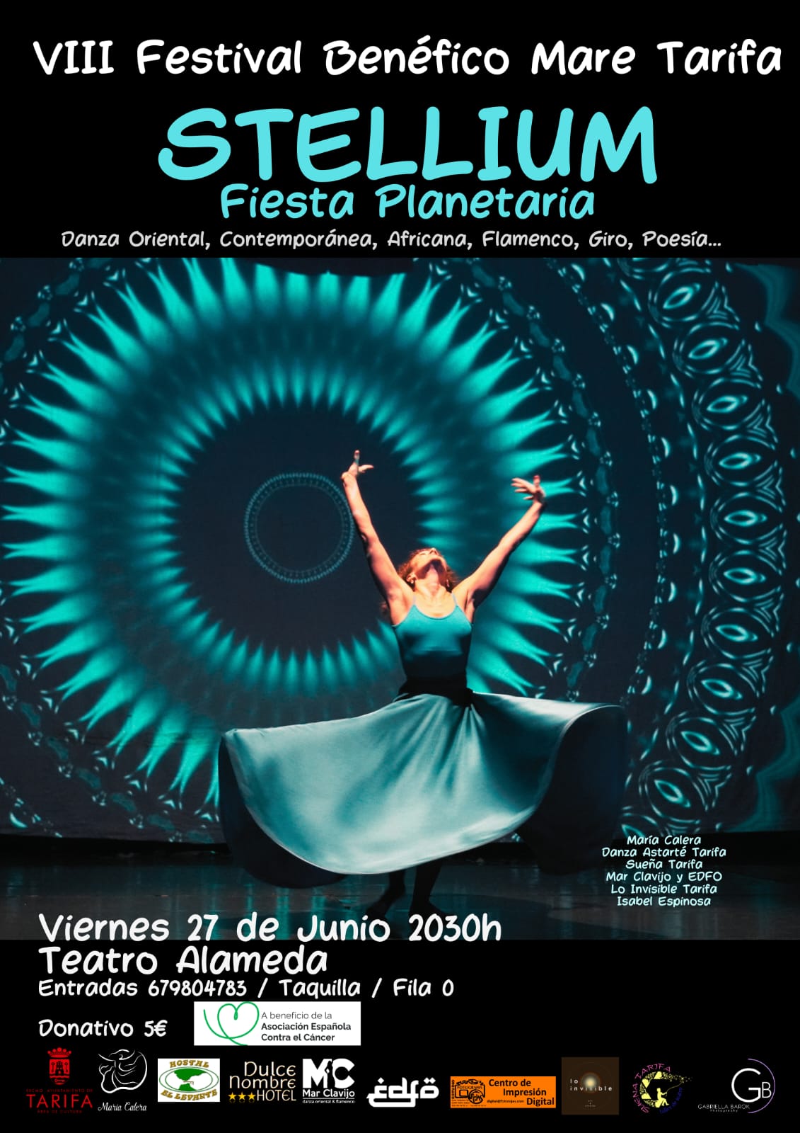 ➡De nuevo la creatividad cómplice de la artista María Calera se ha puesto al servicio de la lucha compartida contra el cáncer. La bailarina es la cabecera de un cartel que reunirá danza oriental, contemporánea, flamenco, giros, ritmos africanos y poesía sobre el escenario del teatro Alameda. El montaje que tendrá como hilo conductor los planetas y llega como el nombre de “Stellium” y es la oferta del teatro Alameda para el próximo 27 de junio.