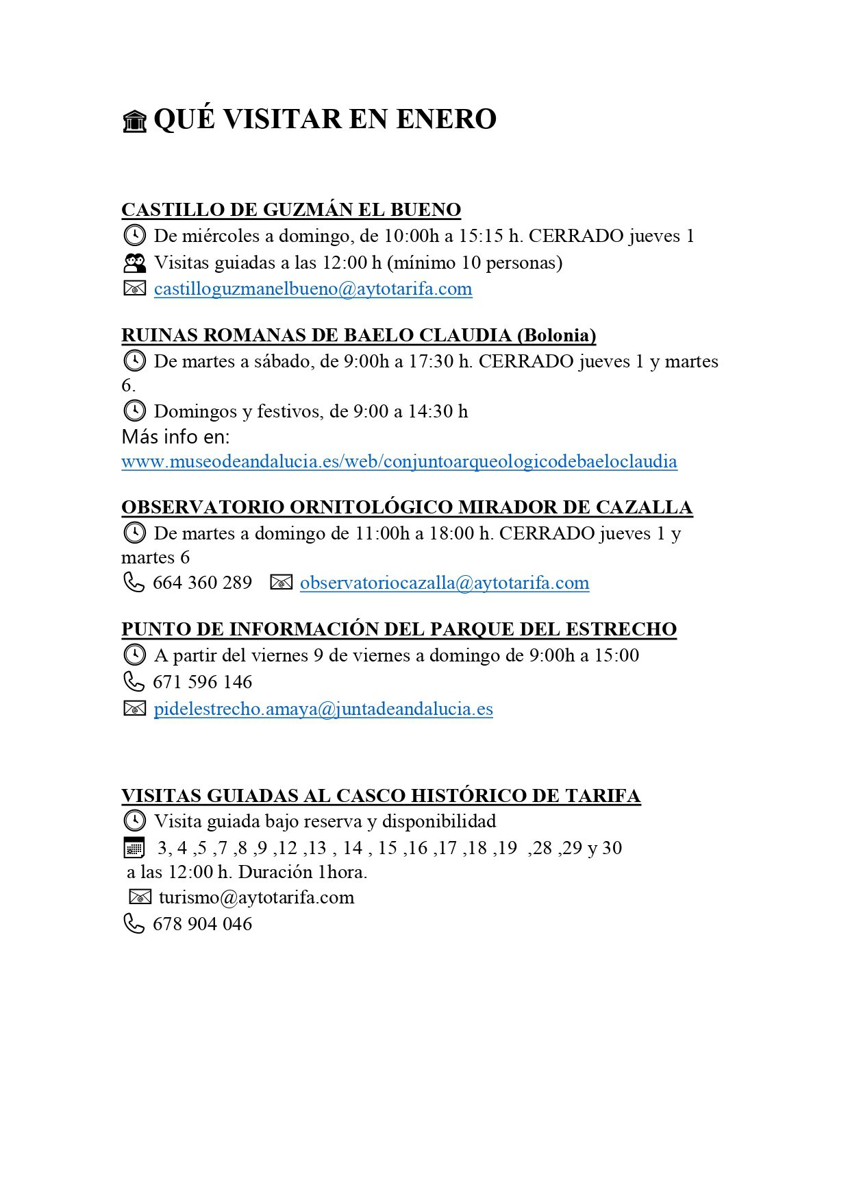 Se informa de las distintas visitas culturales, históricas y de naturaleza que se puieden realizar en Tarifa este mes de enero.