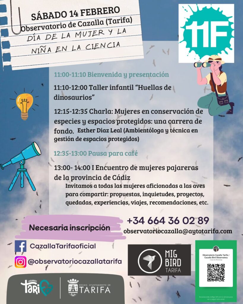 Os invitamos a participar un año más en la jornada que hemos organizado en el observatorio de Cazalla para el día de la mujer y la niña y la ciencia (11F). Este año contamos con un taller infantil práctico sobre huellas de dinosaurios, aprenderemos a buscar fósiles y a reproducir sus formas con arcilla. Contamos también con Esther Díaz Leal, licenciada en ciencias ambientales y técnica superior en gestión, recursos naturales y paisajísticos que nos hablará de su trayectoria y trabajo en gestión de espacios naturales protegidos. Por último, tras la pausa para café y aperitivo, tendremos un encuentro de mujeres pajareras, para compartir inquietudes e ideas acerca de nuestra pasión por las aves. ¡¡Os esperamos en el observatorio de Cazalla el día 14 de febrero!! No olvidéis inscribiros