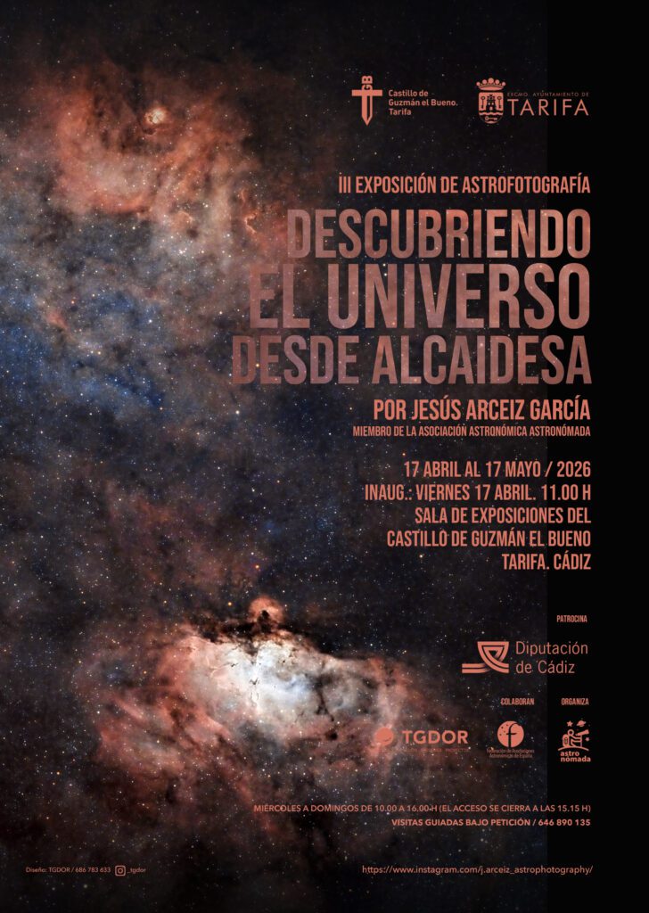 Se anuncia la III Exposición de Astrofotografía titulada “Descubriendo el universo desde Alcaidesa”, realizada por Jesús Arceiz García, miembro de la Asociación Astronómica Astronómada. 📍 Lugar: Sala de exposiciones del Castillo de Guzmán el Bueno en Tarifa📅 Fechas: del 17 de abril al 17 de mayo de 2026🕚 Inauguración: 17 de abril a las 11:00 h 🕒 Horario: de miércoles a domingo, de 10:00 a 15:15 h Organiza el Ayuntamiento de Tarifa, con patrocinio de la Diputación de Cádiz. 👉 En resumen: una exposición de fotografía astronómica abierta al público durante un mes en Tarifa, centrada en imágenes del universo captadas desde Alcaidesa.