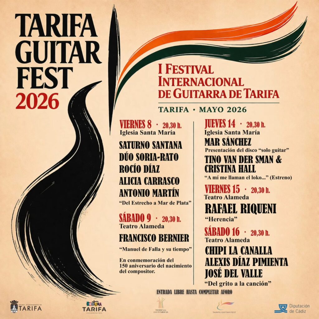 🎶 ¡LA GUITARRA TOMA TARIFA! 🎶 ¿Buscas un plan inolvidable para este mes de mayo? Del 8 al 16 de mayo, Tarifa se convierte en el epicentro mundial de la guitarra con la llegada del Tarifa Guitar Fest 2026. Disfruta de una programación de lujo con artistas de la talla de Rafael Riqueni, Francisco Bernier, Mar Sánchez y muchísimos más, en escenarios tan emblemáticos como la Iglesia de Santa María y el Teatro Alameda. 📅 PROGRAMACIÓN DESTACADA: Viernes 8 (Iglesia Santa María): Gran inauguración "Del Estrecho a Mar de Plata". Sábado 9 (Teatro Alameda): Homenaje a Manuel de Falla por Francisco Bernier. Jueves 14 (Iglesia Santa María): Presentación de "Solo Guitar" y estreno de Tino Van Der Sman & Cristina Hall. Viernes 15 (Teatro Alameda): El maestro Rafael Riqueni presenta "Herencia". Sábado 16 (Teatro Alameda): Gran cierre con "Del grito a la canción". ℹ️ DATOS CLAVE: 📍 Lugar: Tarifa (Iglesia Santa María y Teatro Alameda). 🕗 Hora: Todos los conciertos a las 20:30 h. 🎟️ Entrada: ¡LIBRE hasta completar aforo! No te pierdas esta primera edición que promete ser histórica.