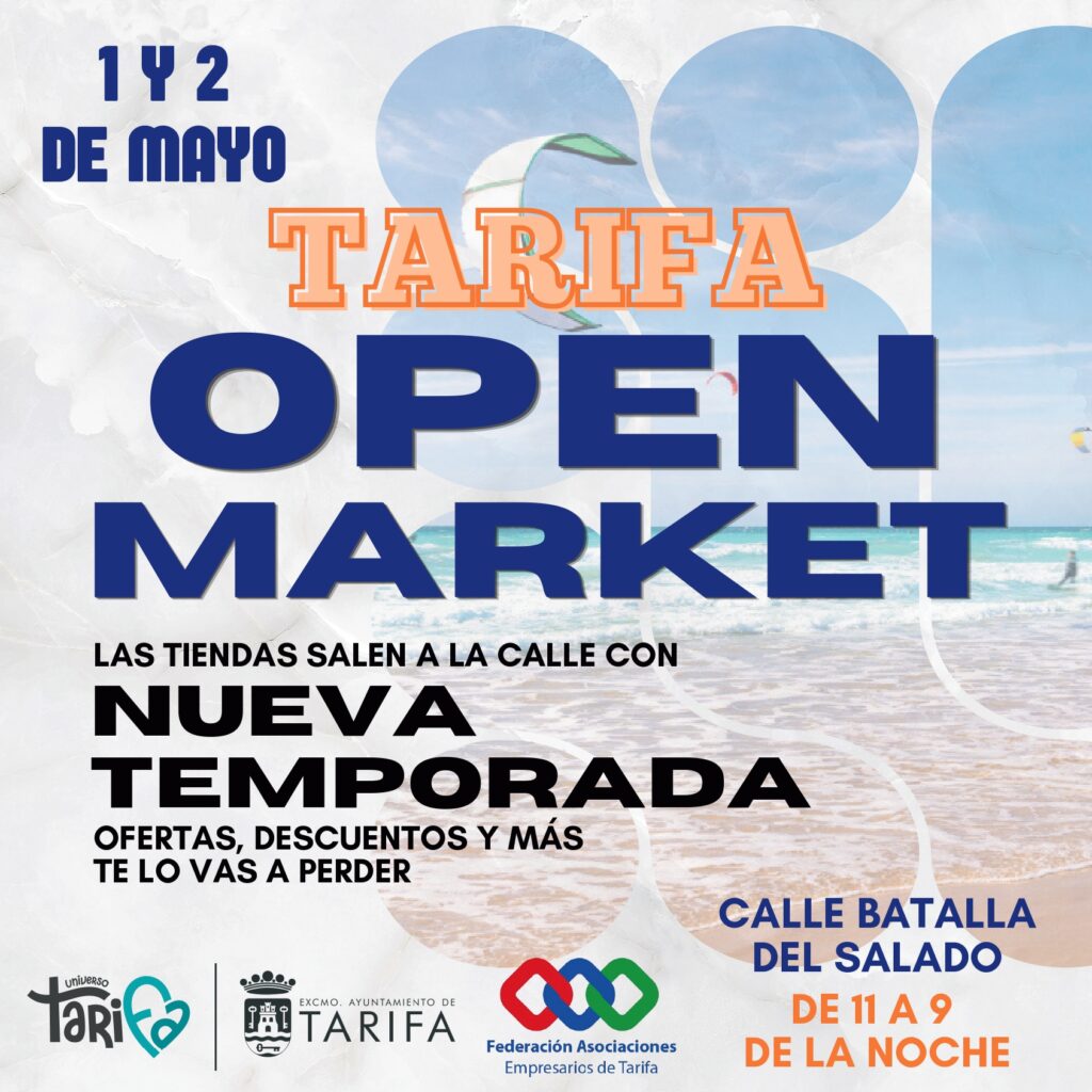¡Llega el mejor ambiente primaveral a Tarifa! 1 y 2 de mayo Calle Batalla del Salado De 11:00 a 21:00 h TARIFA OPEN MARKET abre sus puertas para dar la bienvenida a la nueva temporada con una experiencia única en plena calle: Tiendas locales Ofertas y descuentos exclusivos Ambiente animado Es el momento perfecto para pasear, descubrir novedades y apoyar al comercio local mientras disfrutas del encanto de Tarifa. ¿Te lo vas a perder? ¡Te esperamos!